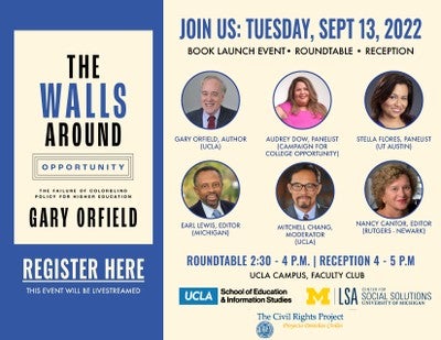 Join us virtually or in-person at UCLA on September 13th for a roundtable discussion and Q&A celebrating the launch of: The Walls Around Opportunity: The Failure of Colorblind Policy for Higher Education, CRP Co-director Gary Orfield’s contribution to the Our Compelling Interest series.