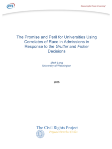 - “The Promise and Peril for Universities Using Correlates of Race in Admissions in Response to the Grutter and Fisher Decisions,” by Mark Long (University of Washington).
